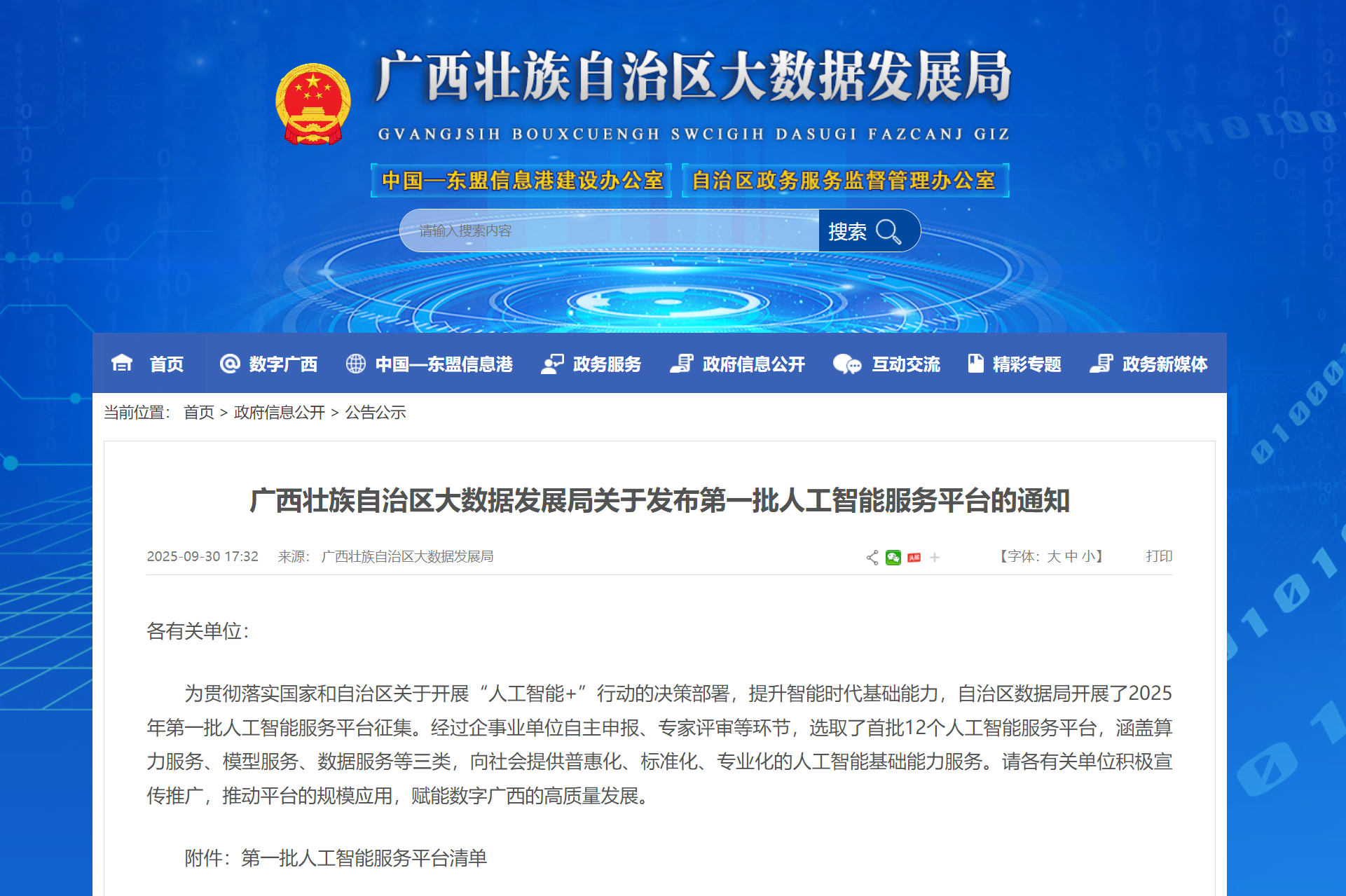 北部灣大數(shù)據(jù)交易中心成功入選廣西首批人工智能服務平臺名單 2025-10-10
